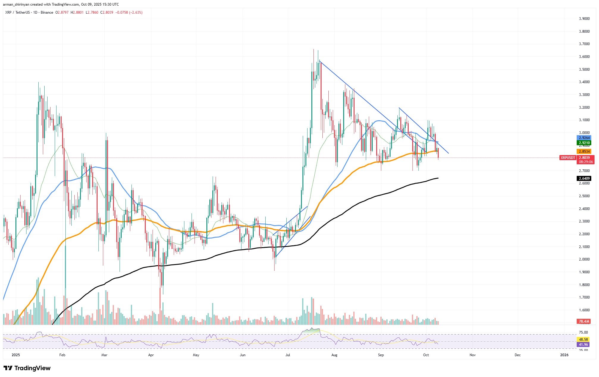 Following the loss of the 100-day EMA, one of its most crucial technical levels, XRP looks to be about to go into a possible freefall. The asset has now decisively closed below this moving average, indicating that bearish pressure is starting to take control once more after holding above it for weeks.