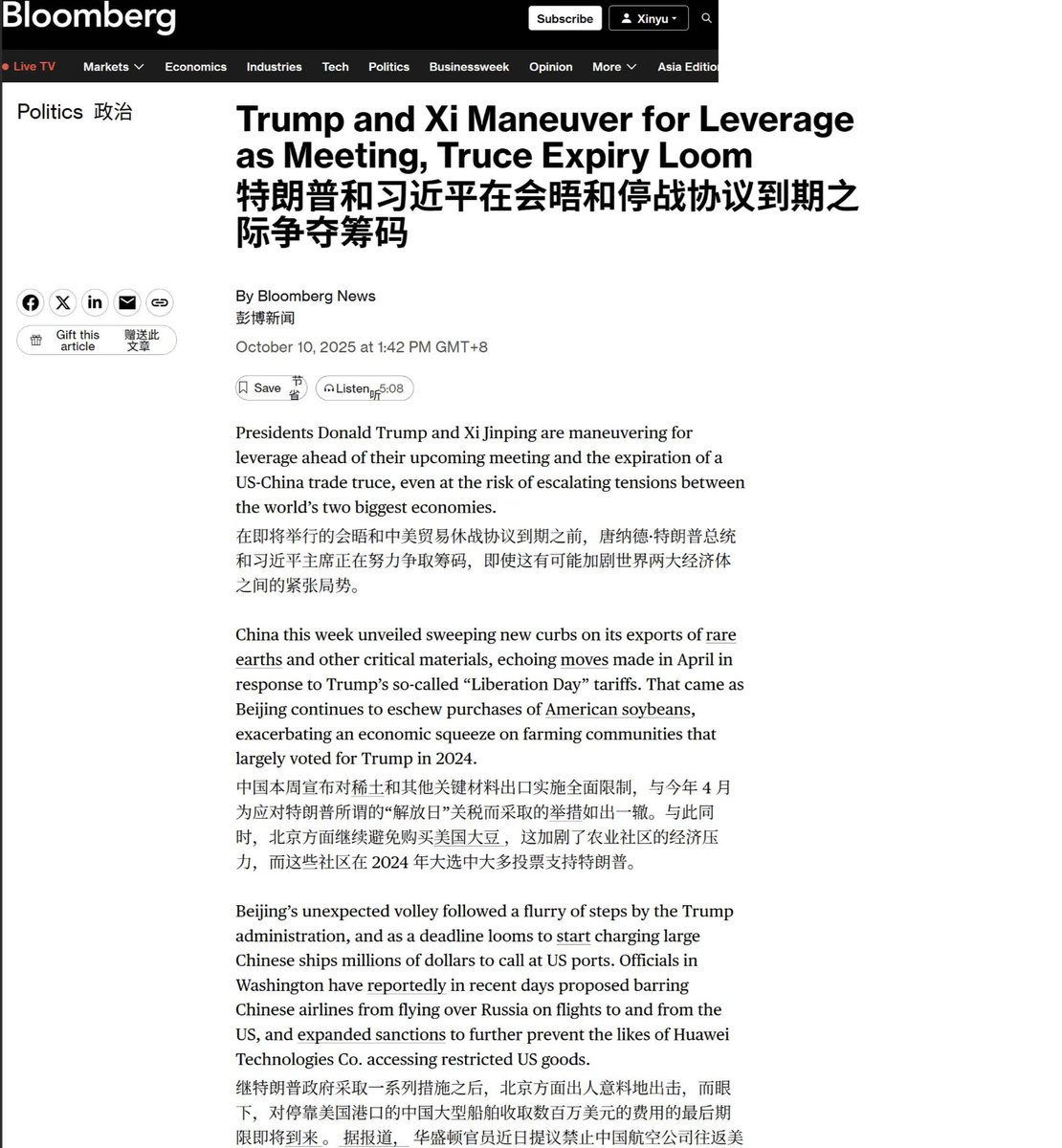 Currently, the US and China are ramping up their strategies regarding the tariff trade war that will restart on November 10. The US has banned the export of AI chips, while China has imposed sanctions on rare earth exports and soybean imports, and today restricted the export of key lithium battery materials and technologies.