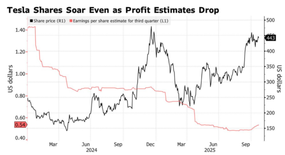 ● 科技股高估值与现实业绩的差距。以特斯拉为例,市场对于其AI与机器人长期叙事与当前汽车制造商业绩下滑之间的分歧日益加大。